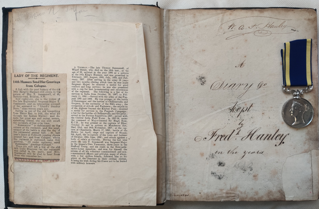 Rose was clearly a careful custodian of the diary as it survived its travels and is now in the collection at HorsePower, along with Schoolmaster Serjeant Frederick Hanley’s Punjab Medal. She has added her own little touches, inserting newspaper clippings relating to her own life.