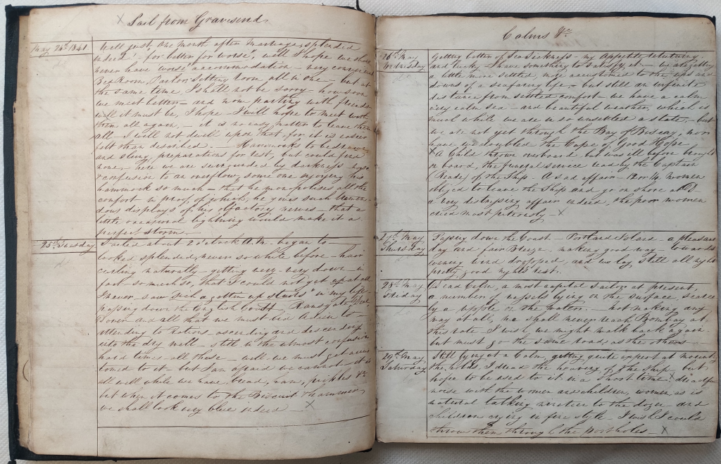 ‘May 24, 1841 – Left Canterbury at half past. Some merry fellows amongst us who made much laughter. The band played occasionally: some wet handkerchiefs, for the sake of the girls we left behind us. Arrived at Herne Bay about a quarter to eight o’ clock. Breakfasted at the Head Inn. After some few arrangements embarked on board the steamboat for our new barracks, no more terra firma until we arrive [at] Bombay. The Band playing “The Girl I Left Behind Me.” “Rule Britannia,” and such appropriate tunes as would touch the tender breasts of anyone for at such times one cannot help being affected with the scenes before him.’