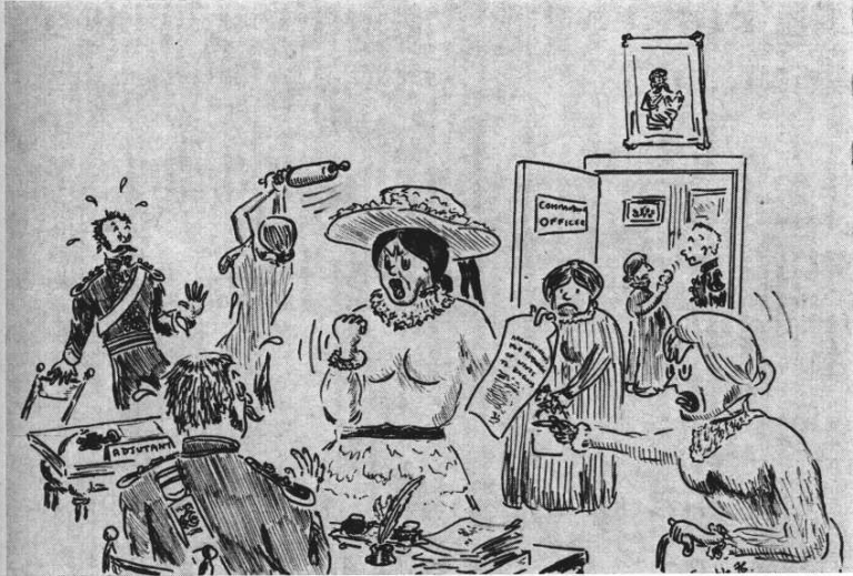 Colonel Doherty may have displayed great bravery at Ramnuggur but was no match for the power of the ‘Wives Club’. The scene was pictured in the Lloyds weekly News article and re-imagined in The Hawk Journal of 1976.