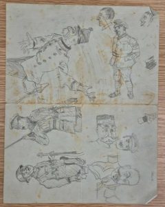 Image one shows a blue sheet of paper with numerous pencil sketches of military characters. Judging from their uniforms these are likely a combination of both British and French soldiers, possibly referenced from life and the men he encountered during the war. The over-the-top expressions evokes an almost cartoon like quality in the pieces.