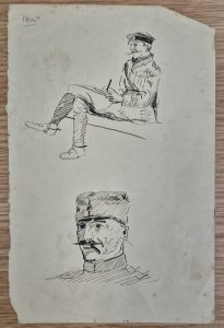 Image two shows some much more refined pieces, ink sketches of a seated soldier smoking a cigarette, a writing board propped up on his folded legs. Beneath is a bust portrait of a different soldier, gazing out at the viewer, also smoking a cigarette.